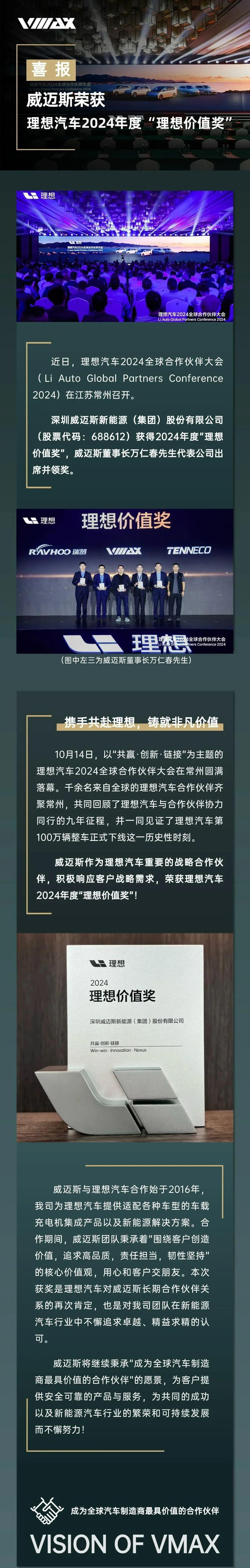 威迈斯荣获理想汽车2024年度“理想价值奖”