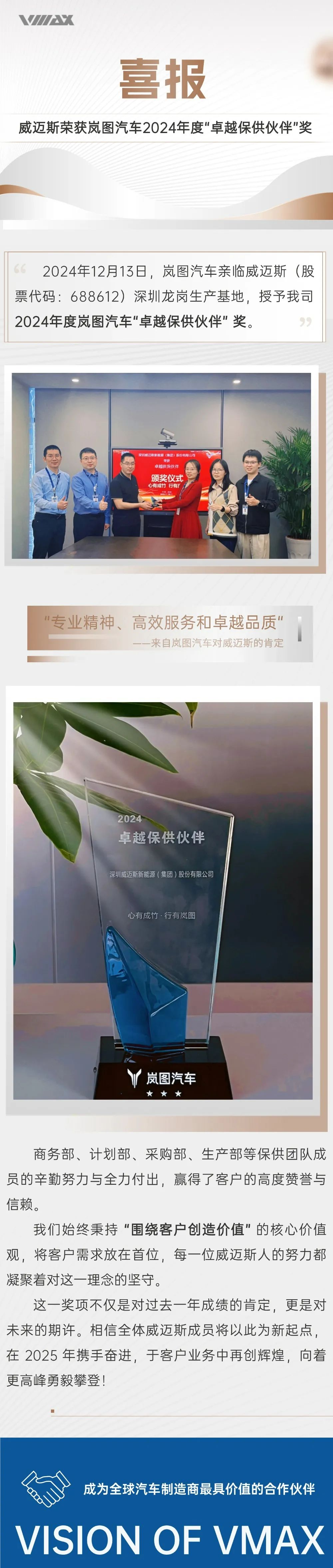喜报 | 威迈斯荣获岚图汽车2024年度“卓越保供伙伴”奖